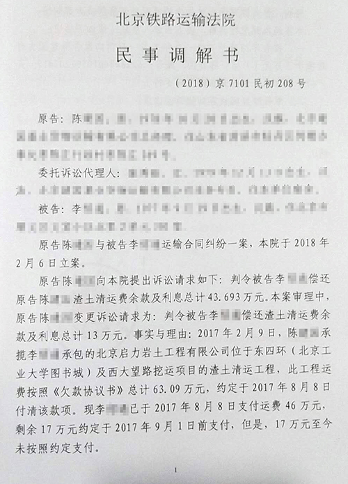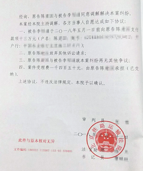 经我商会和调解中心调查并收集证据,为了更好的维护陈XX的合法权益,调解中心将案件起诉到法院。此案2018年2月6日由北京铁路运输法院受理,2018年3月20日开庭审理,在法官的主持调解下,被告李XX主动提出向原告陈XX偿还剩余工程款130000元,最后本案以民事调解书结案。